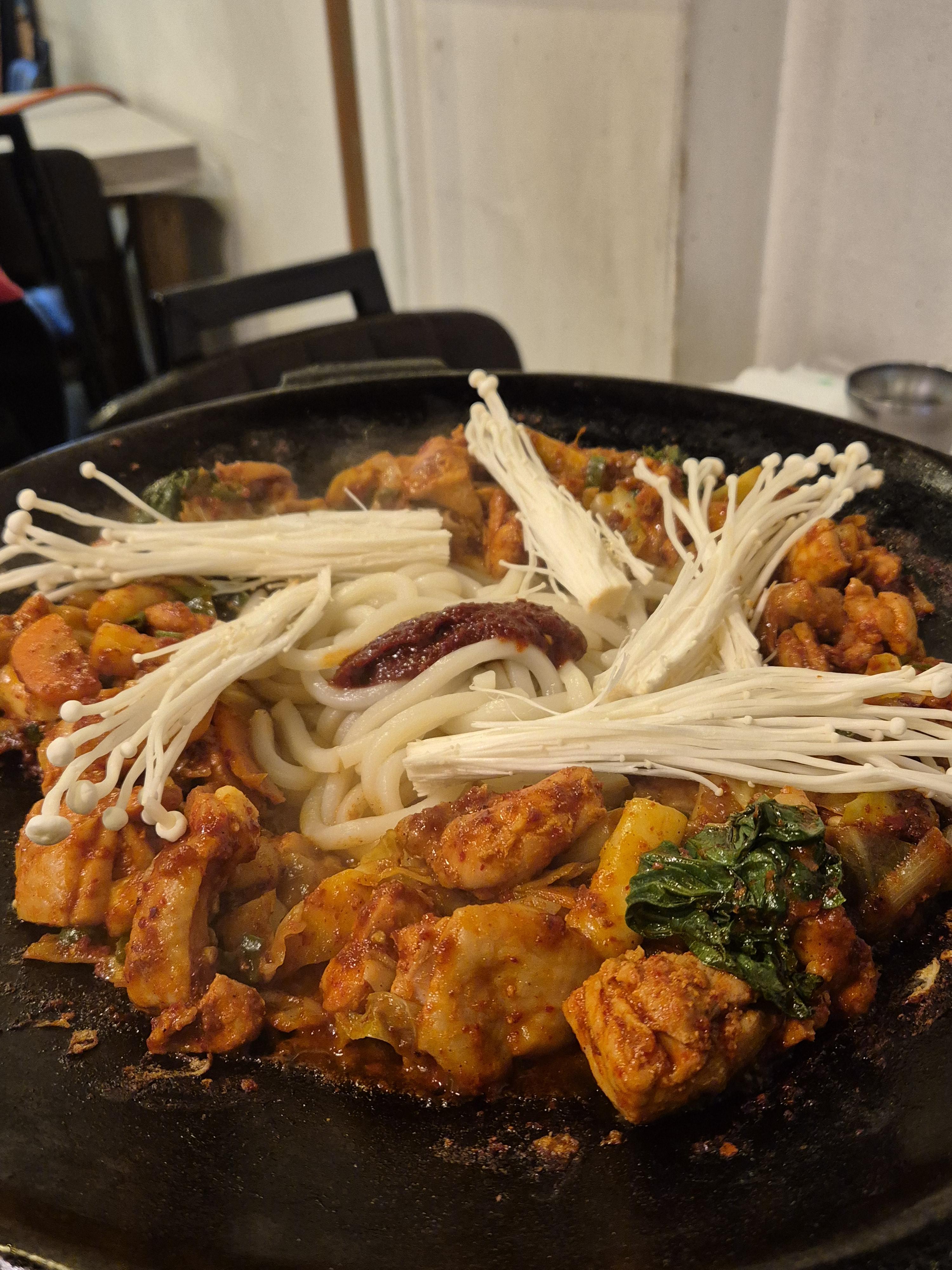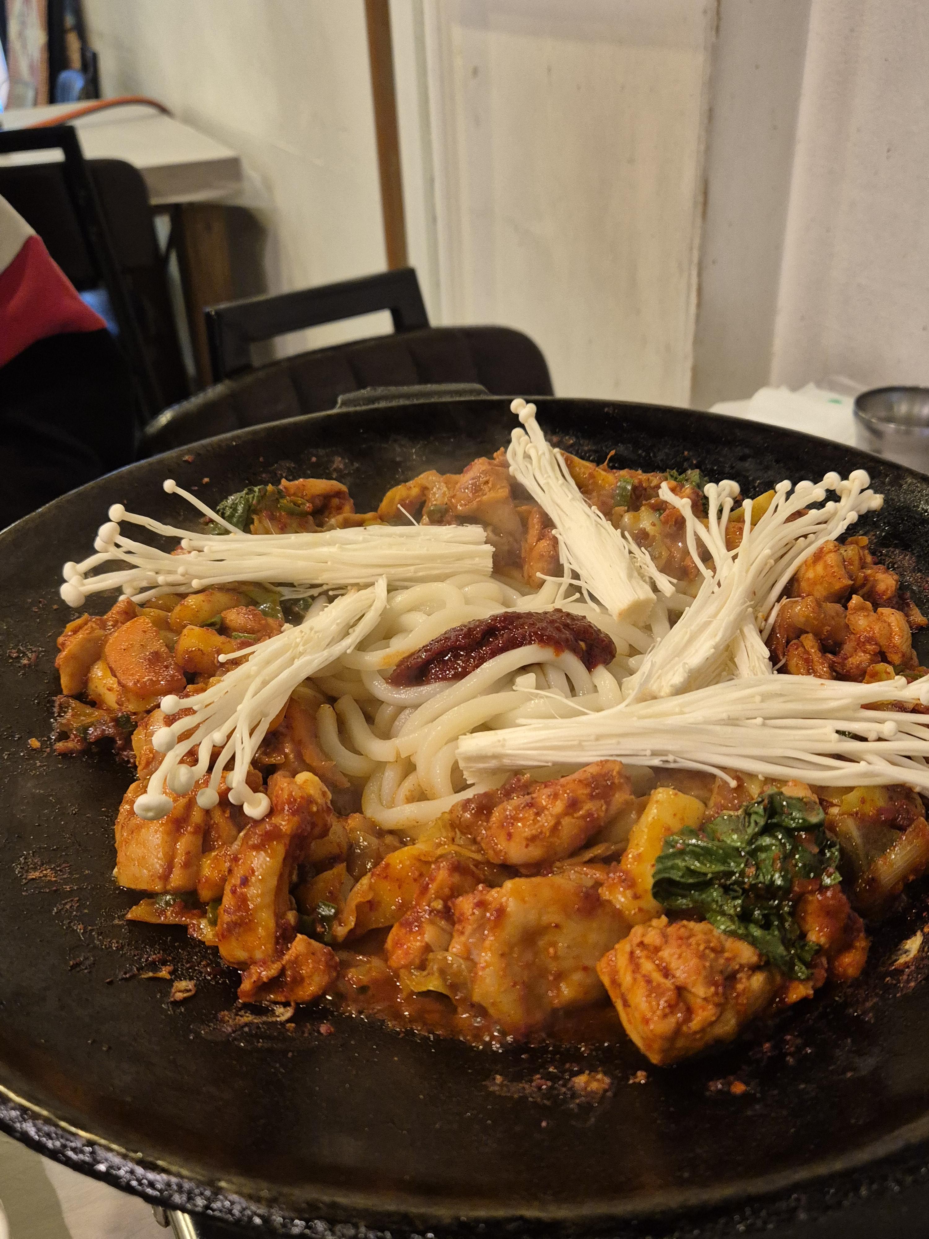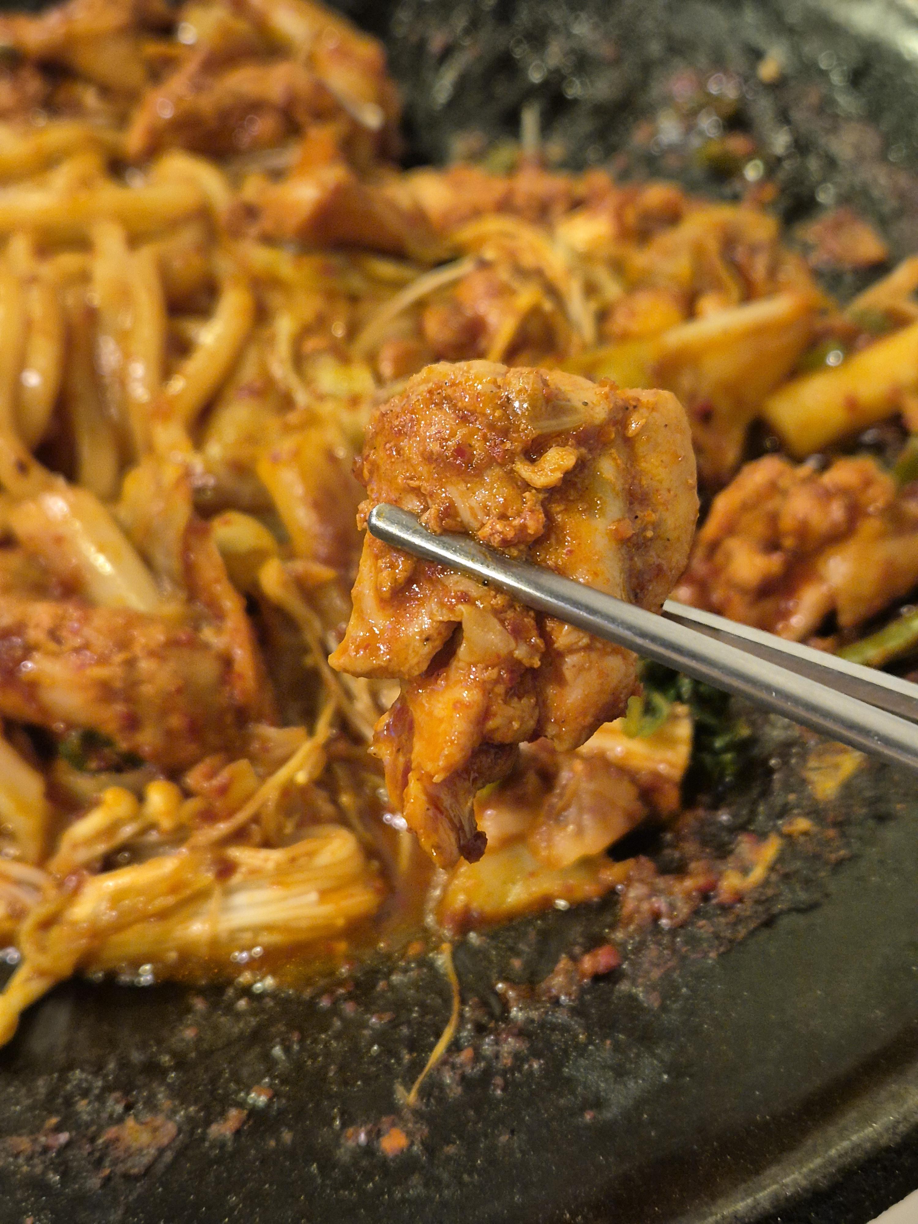 2인분 양이 꽤 푸짐하고 흔히 알고 있는 닭갈비 보다는 약간 닭사리 느낌이 있었고 우동과 팽이버섯 그리고 야채를 잘 섞어봤습니다.