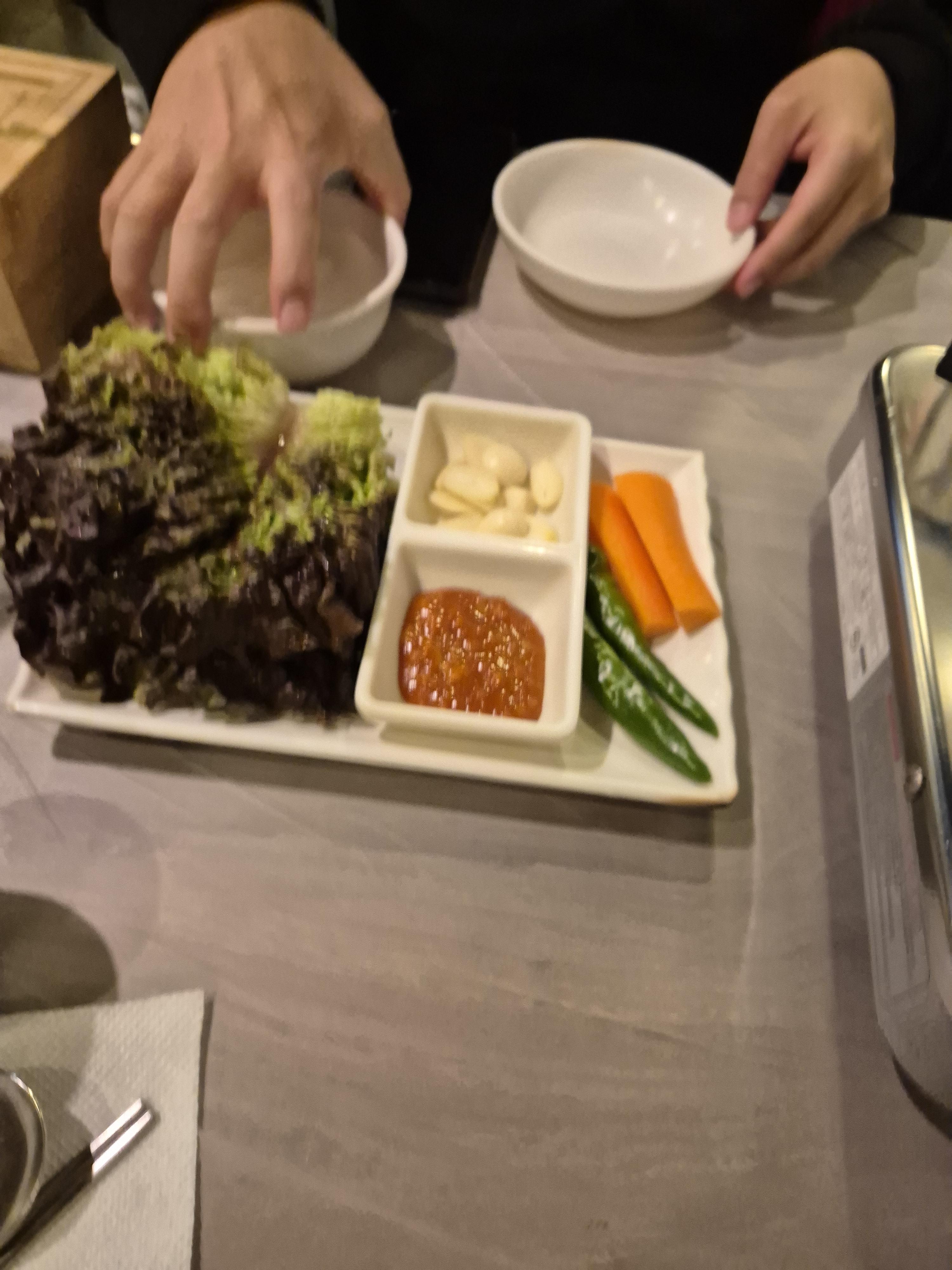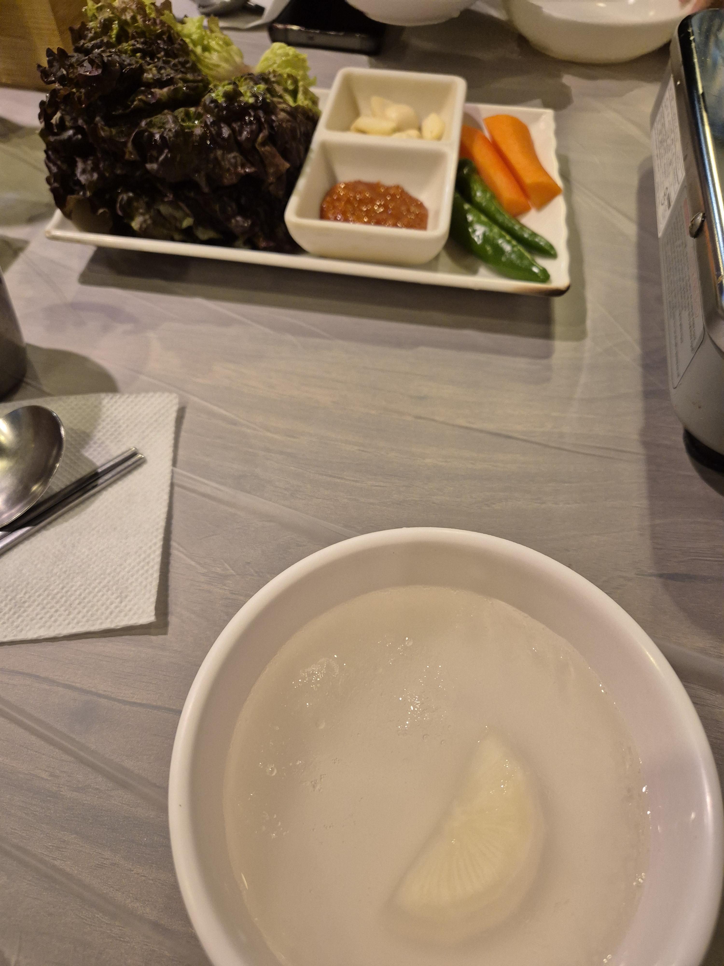 반찬으로 동치미, 상추, 쌈장, 마늘, 고추, 당근 끝이었습니다.