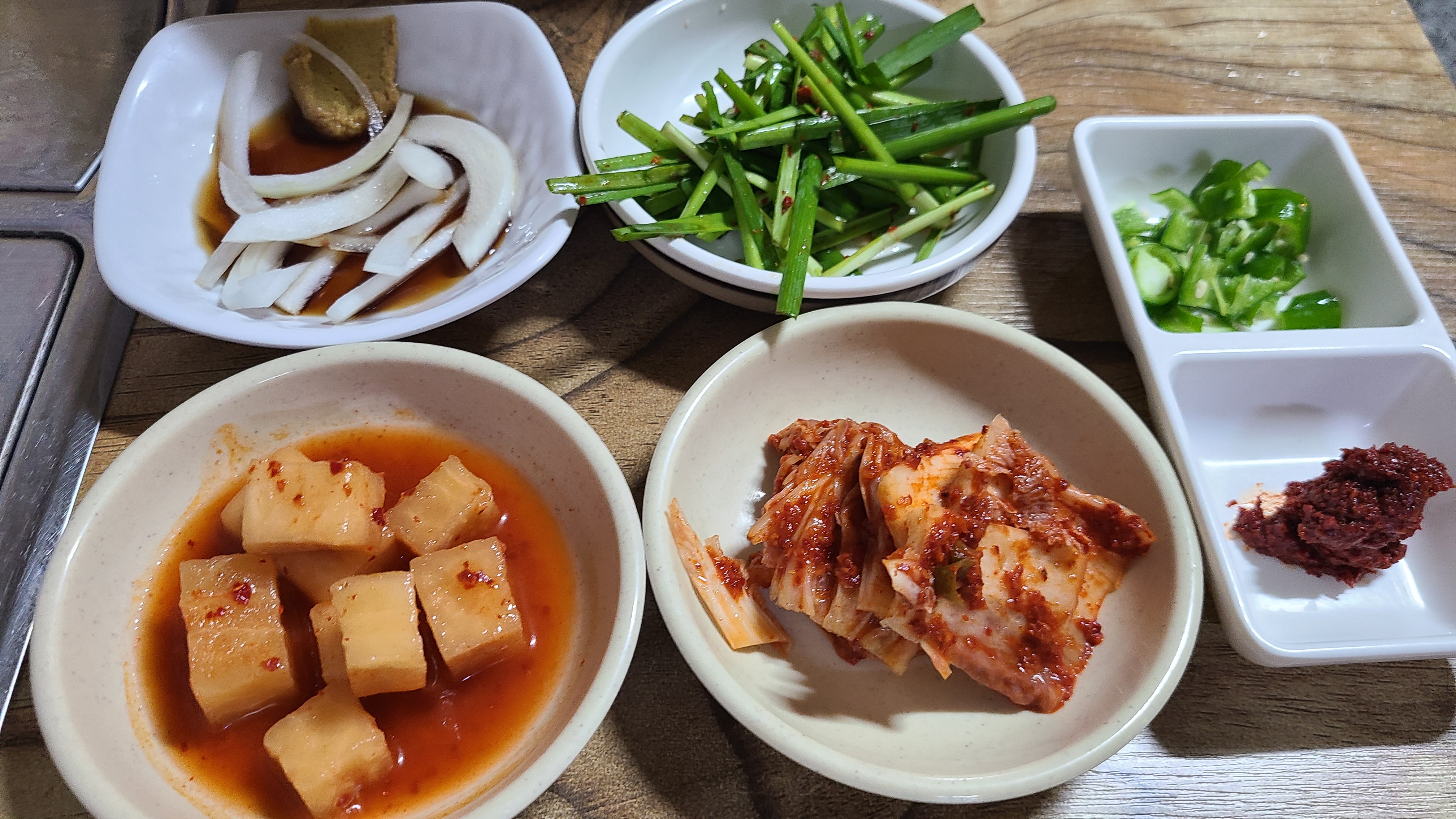깍두기, 김치, 양파소스, 부추무침, 청양고추와 양념장 내어주셨습니다.